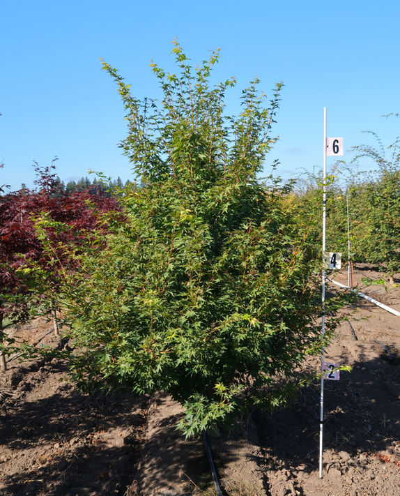 The foliage of this maple is dense and ovular in shape. Autumn turns it to a ball of fire, with deep oranges and reds consuming it.